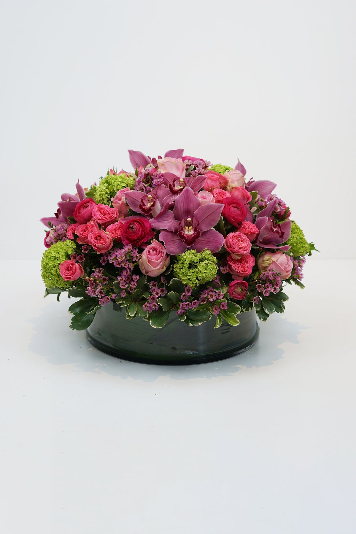 A luxurious arrangement with vibrant shades of pink and green blooms, presented in a stylish glass bowl. This display is perfect as a table centrepiece or show-stopping gift. Our florists may substitute flowers and sundries for a suitable alternative, similar in style, quality and value depending on availability.